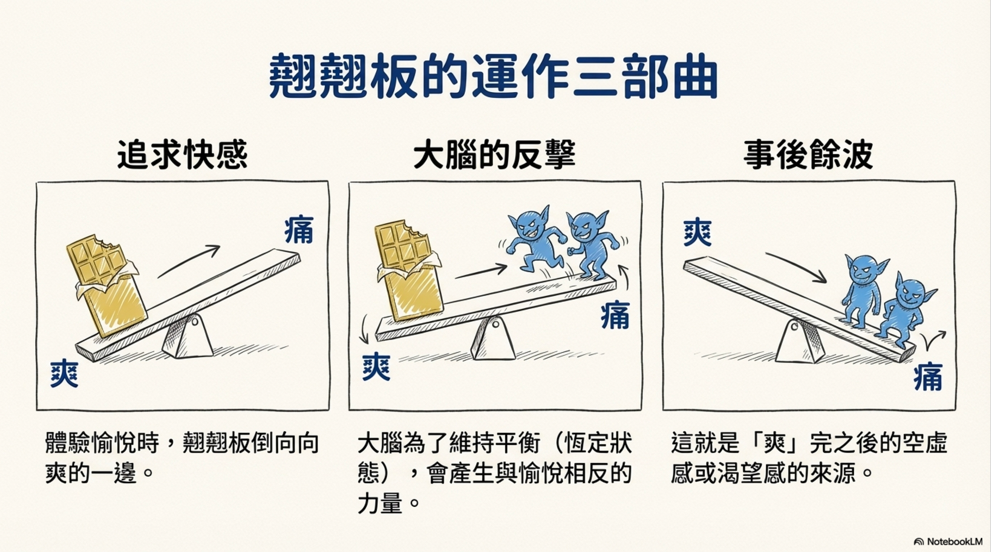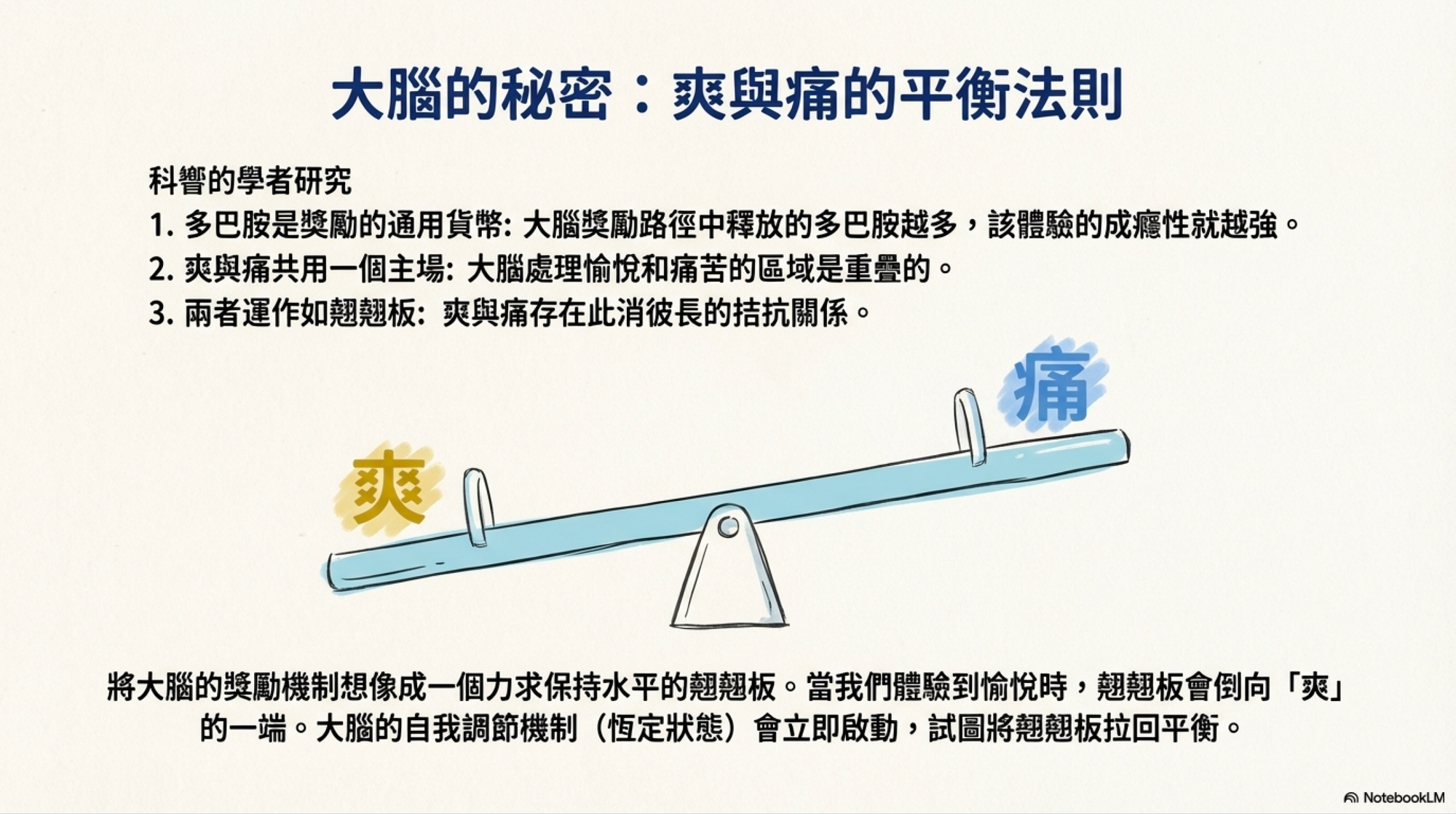 當我們體驗到愉悅(吃甜點、滑到好笑的Threads文),多巴胺釋放,翹翹板會向快樂端傾斜然而,大腦最重要的任務是維持恆定,它不允許翹翹板一直卡在快樂端。